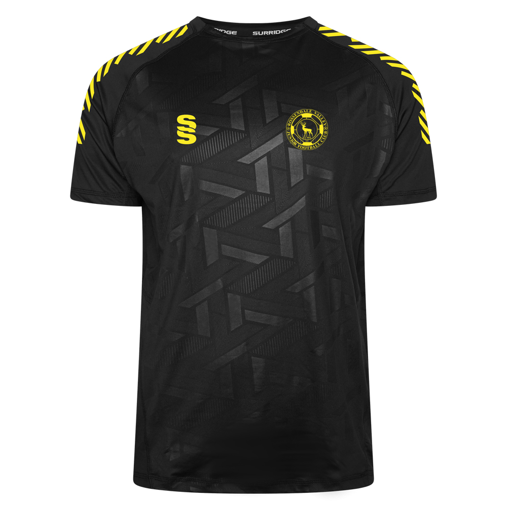 Crew neck fitted polyester interlock material with highly modern print to the from panel